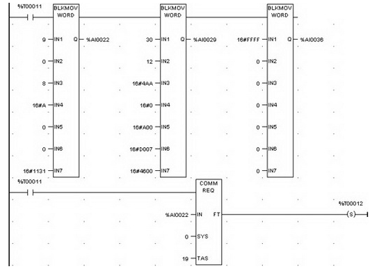 2) PLC使用串行I/O通讯协议与RFID读写器通讯。串口初始化、设置缓冲区、清除缓冲区、写串口、读串口状态等操作都是先通过一组BLKMOV WORD指令给COMMREQ的数据块赋值,然后执行COMMREQ指令完成的。例如,以下语句(见图3)通过RFID读写器写10个FF(46H)到标识中,从第一个字节写起。